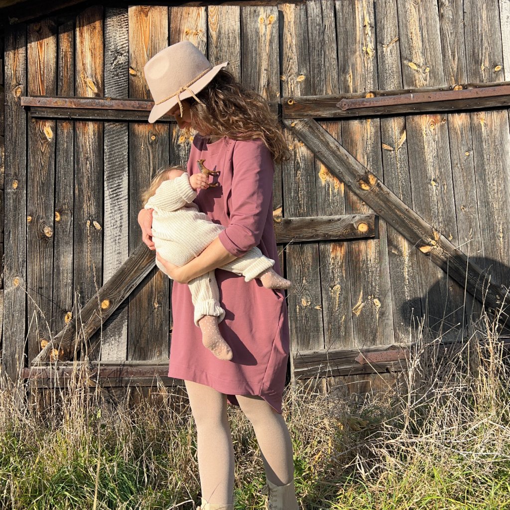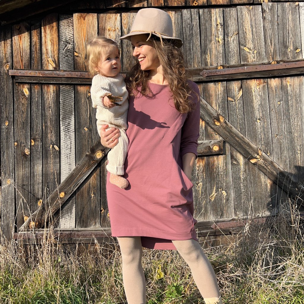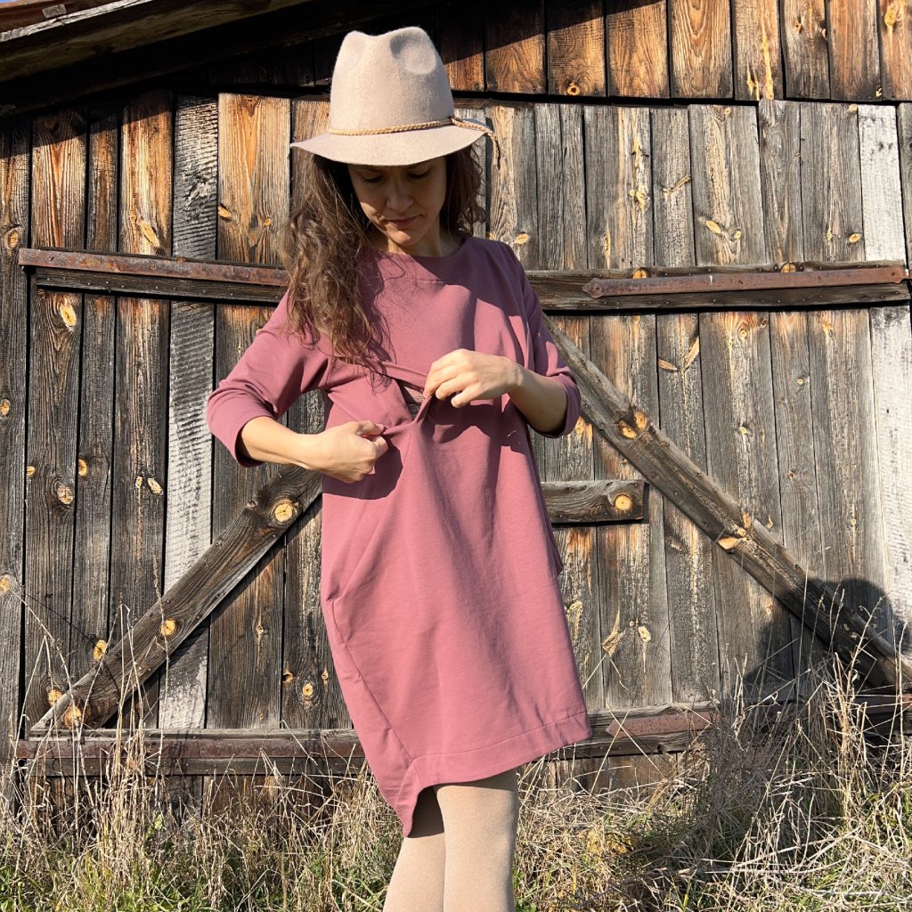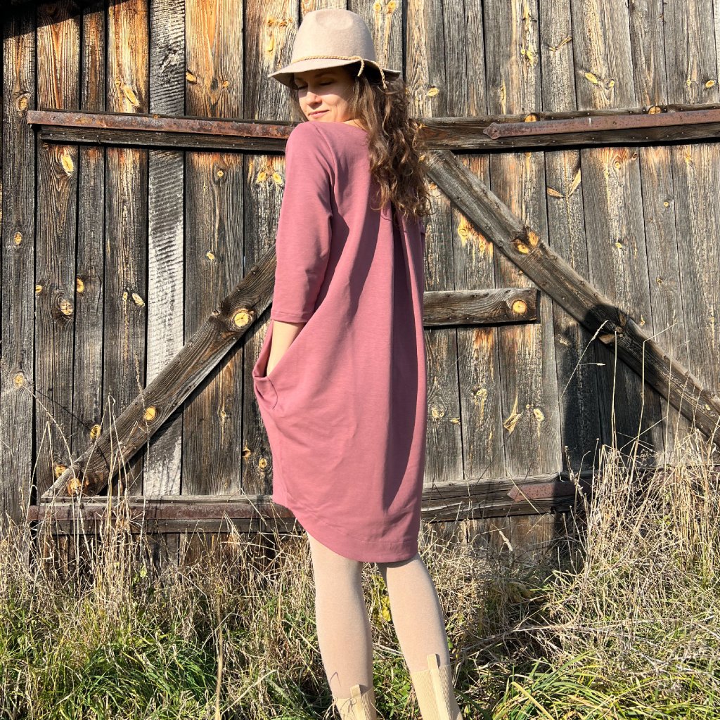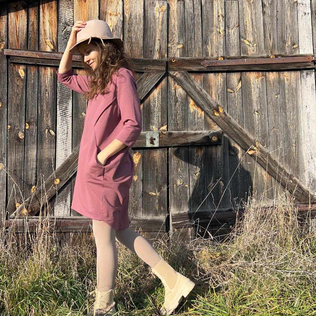 Voľný oversize strih je vhodný aj pre tehotné budúce mamičky. Šaty sú s 3/4 rukávom, v zadnej časti predĺžené a doplnené efektným protizáhybom. Šaty majú po bokoch 2 stryté vrecká.